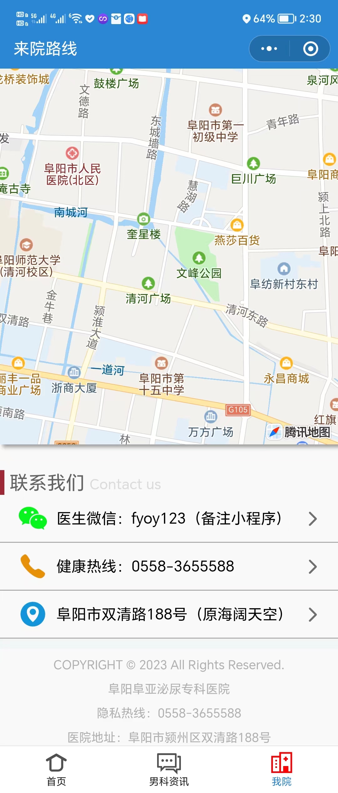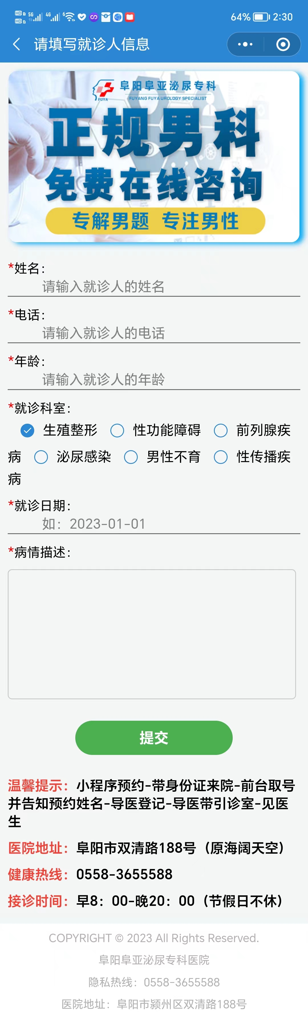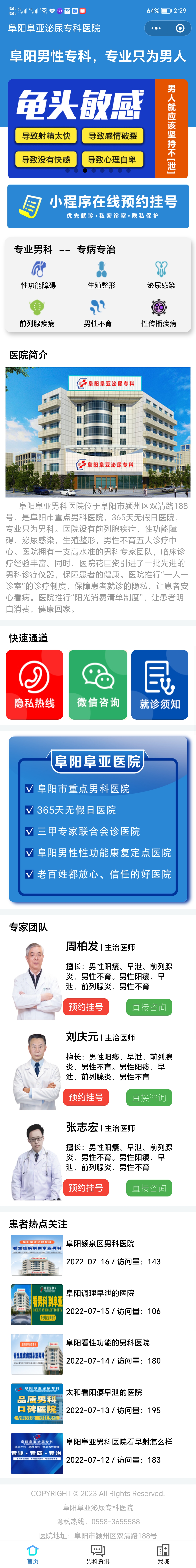 我的位置: 主页 > 医院概况 > 新闻动态 > 阜阳阜亚男科医院小程序上线啦! 阜阳阜亚男科医院小程序上线啦,扫码进入小程序,可在小程序端预约挂号,查看医院最新资讯,医院专家,医院科室,医生在线咨询等。 长按保存图片扫码体验小程序 推荐阅读 上一篇:在阜阳看男科去哪个医院好些? 下一篇:没有了 一切以患者为中心 关注更多男科疾病症状 阳痿早泄 包皮包茎 做爱时间太短 龟头红点疙瘩 菜花状赘生物、肉粒 阴茎勃起不坚,软的快 尿频尿急 阴囊潮湿、发痒 尿道口红肿伴有微痛感